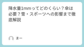 生活 降水量1mmってどのくらい?傘は必要?雪・スポーツへの影響まで徹底解説 天気予報でよく耳にする「降水量1mm」。なんとなく小雨かな?と思うけれど、実際にはどのくらいの雨なのか、傘が必要なのか迷ったことはありませんか。実は「降水量1mm」は0.5〜1.9mmの幅があり、状況によっては本降りに近い雨になることもあり... 生活